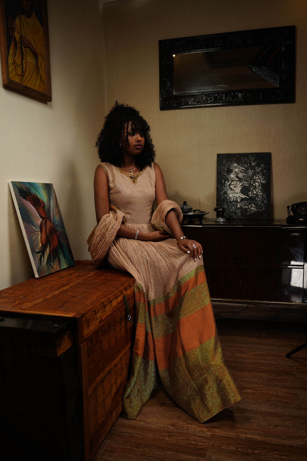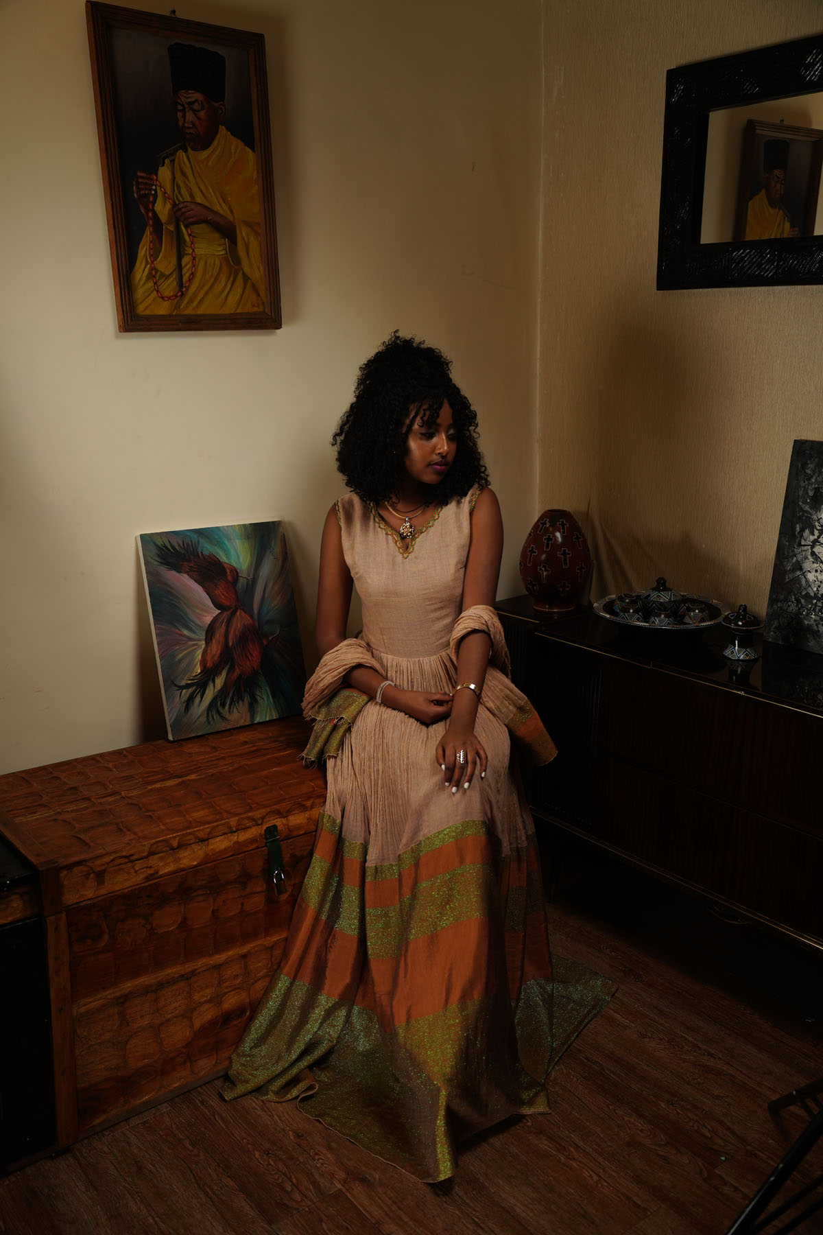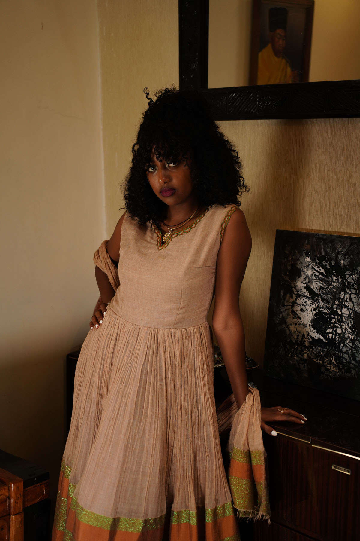 Celebrate the Ethiopian New Year in style with our exquisite Apricot Empire Dress. Crafted from luxurious cotton, this handcrafted piece features a captivating apricot color hue, exuding sophistication with a touch of contemporary flair. The V-neckline and sleeveless design offer a modern touch, while the hand-embroidered green circle decor and sparkling blue and golden (Werkezebo) accents add a touch of opulence.