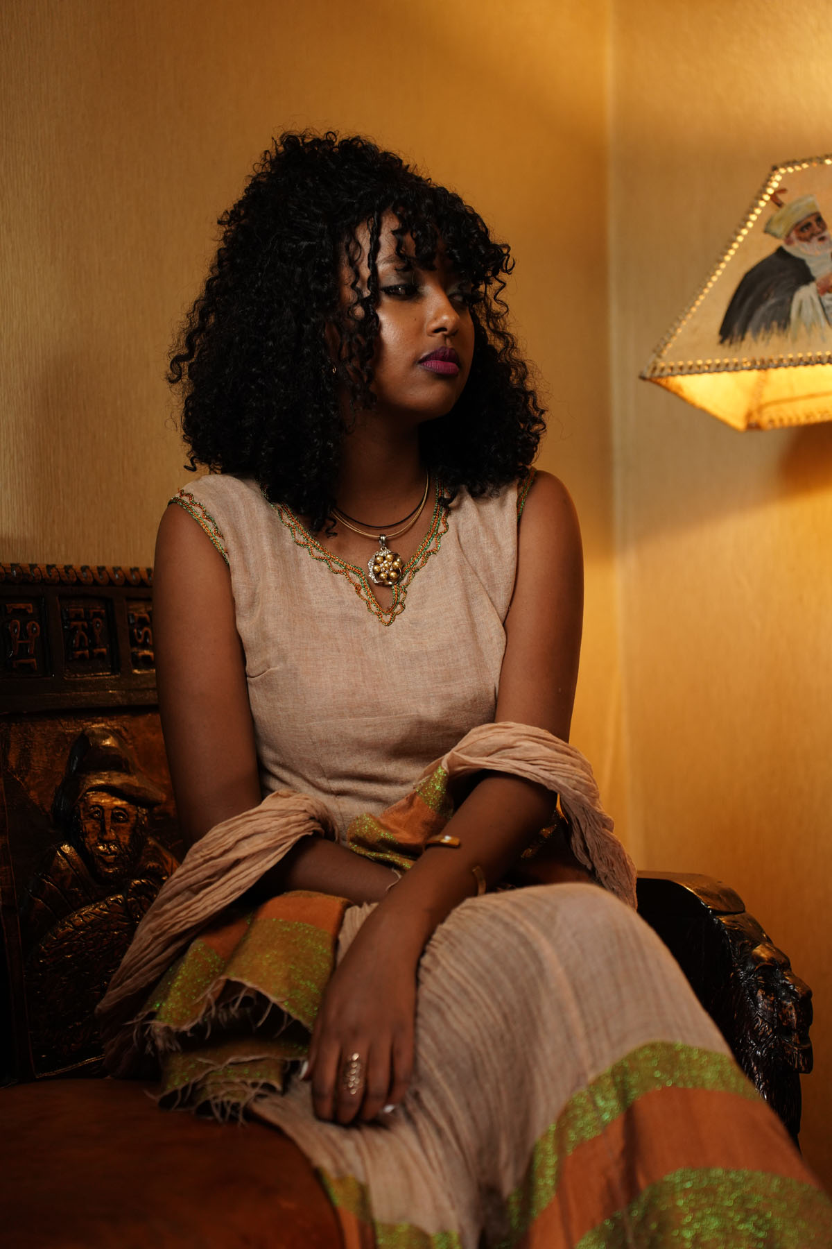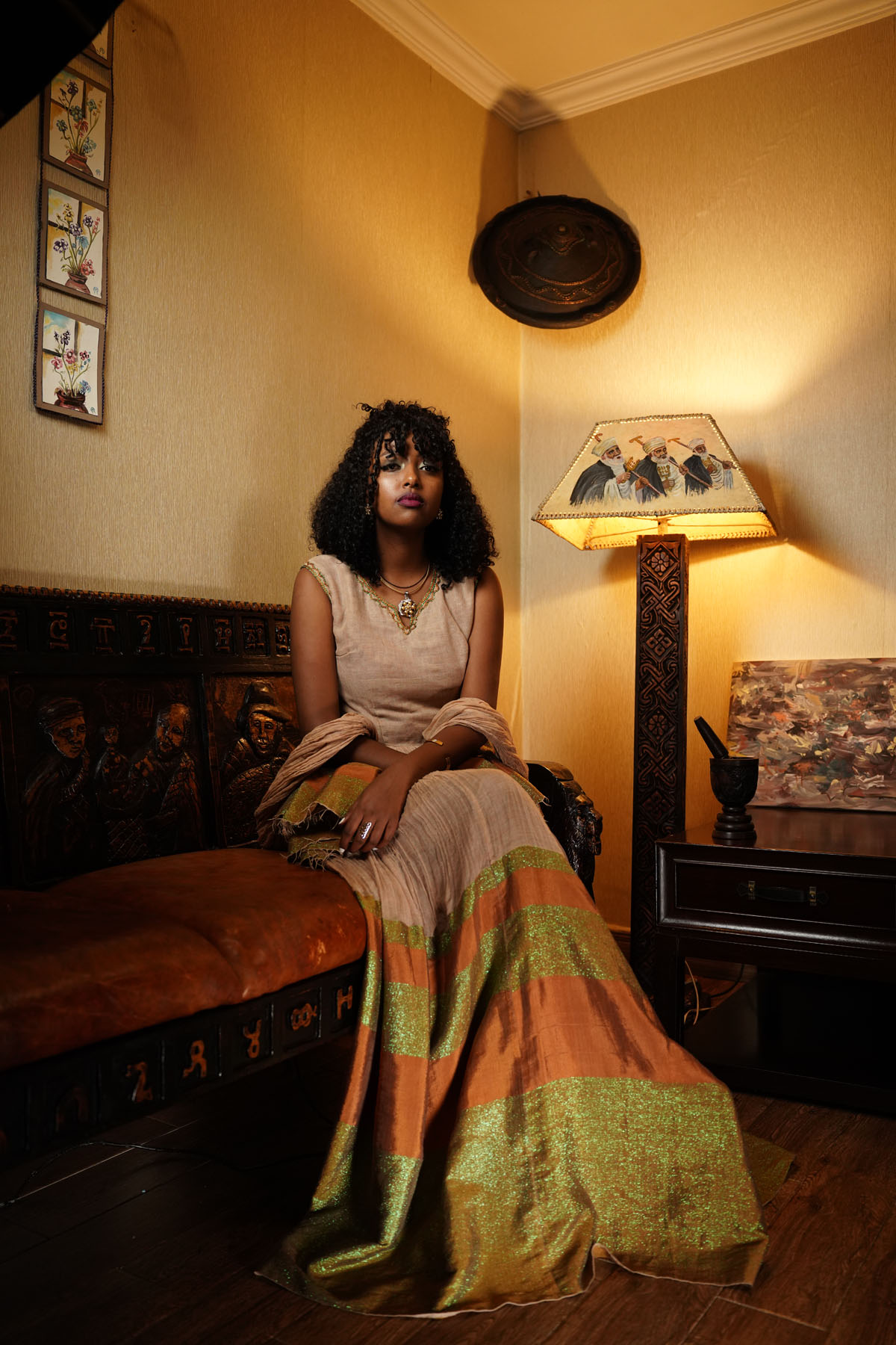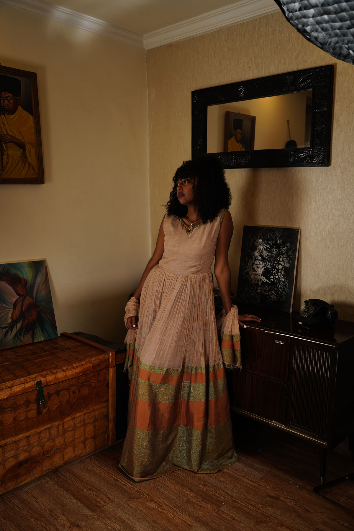 Celebrate the Ethiopian New Year in style with our exquisite Apricot Empire Dress. Crafted from luxurious cotton, this handcrafted piece features a captivating apricot color hue, exuding sophistication with a touch of contemporary flair. The V-neckline and sleeveless design offer a modern touch, while the hand-embroidered green circle decor and sparkling blue and golden (Werkezebo) accents add a touch of opulence.