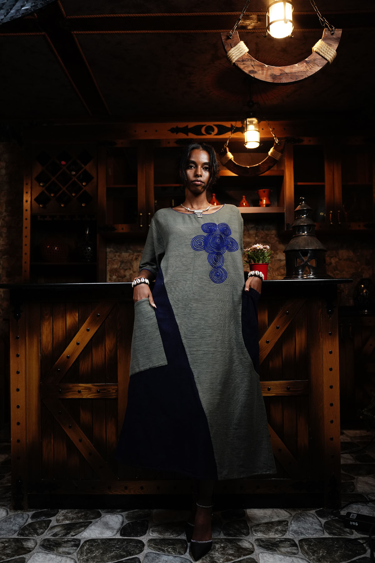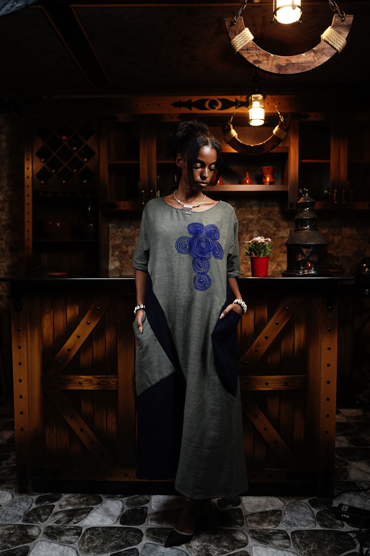 Features: Loose that is dark blue and light gray fabric long dress with Pockets and and a blue decor at left chest.
