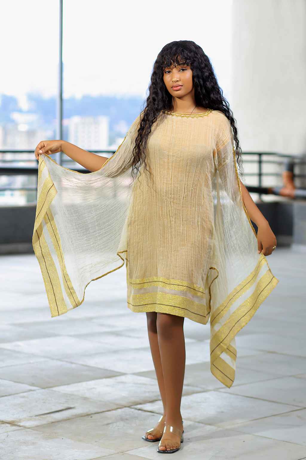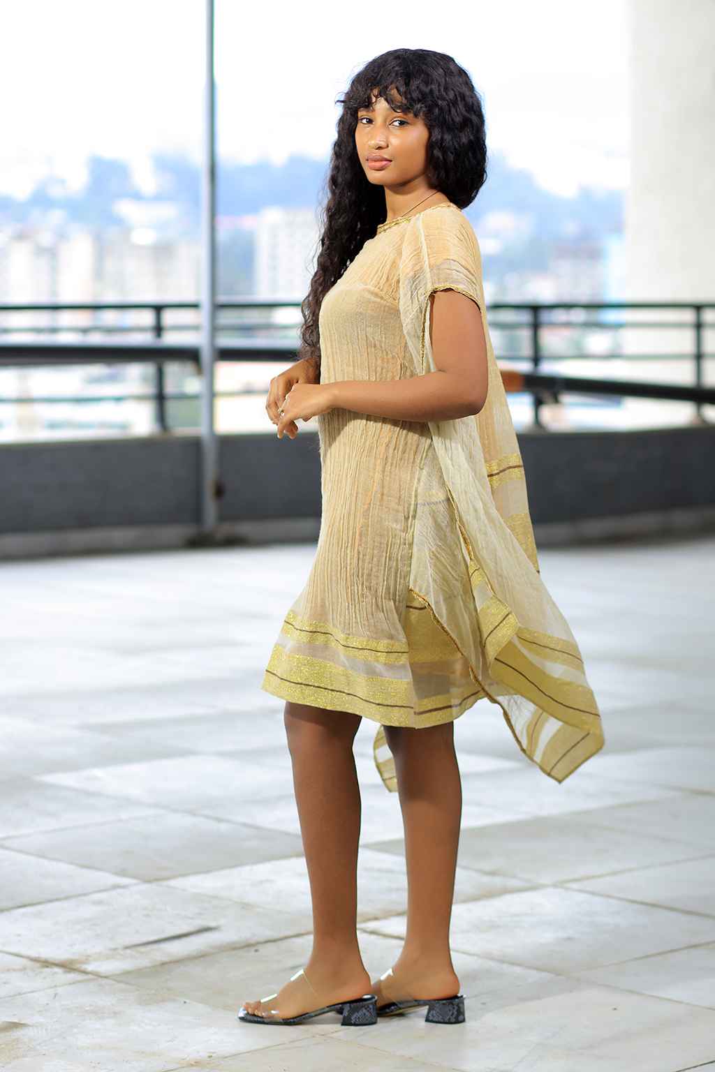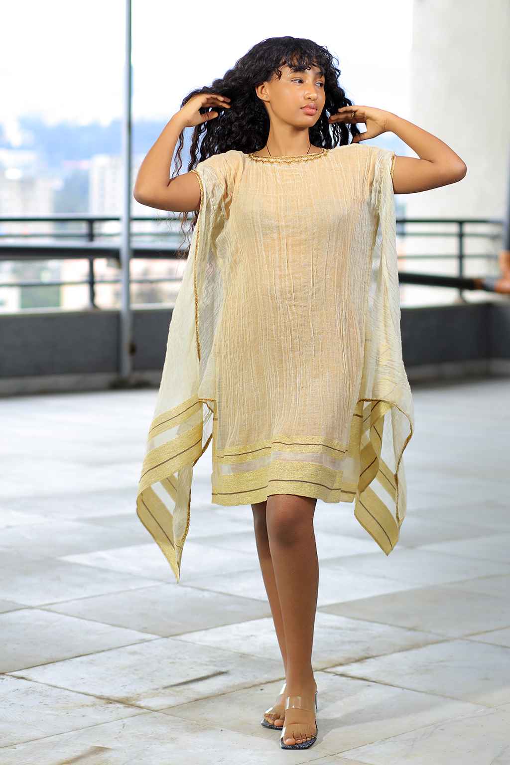 Cream colored Summer mid dress with Khaki gold color Stripe Tillet From 2015 (2022) Ethiopian new year collection Hand made 100% cotton Dress number: I 028 Size: S | M | L