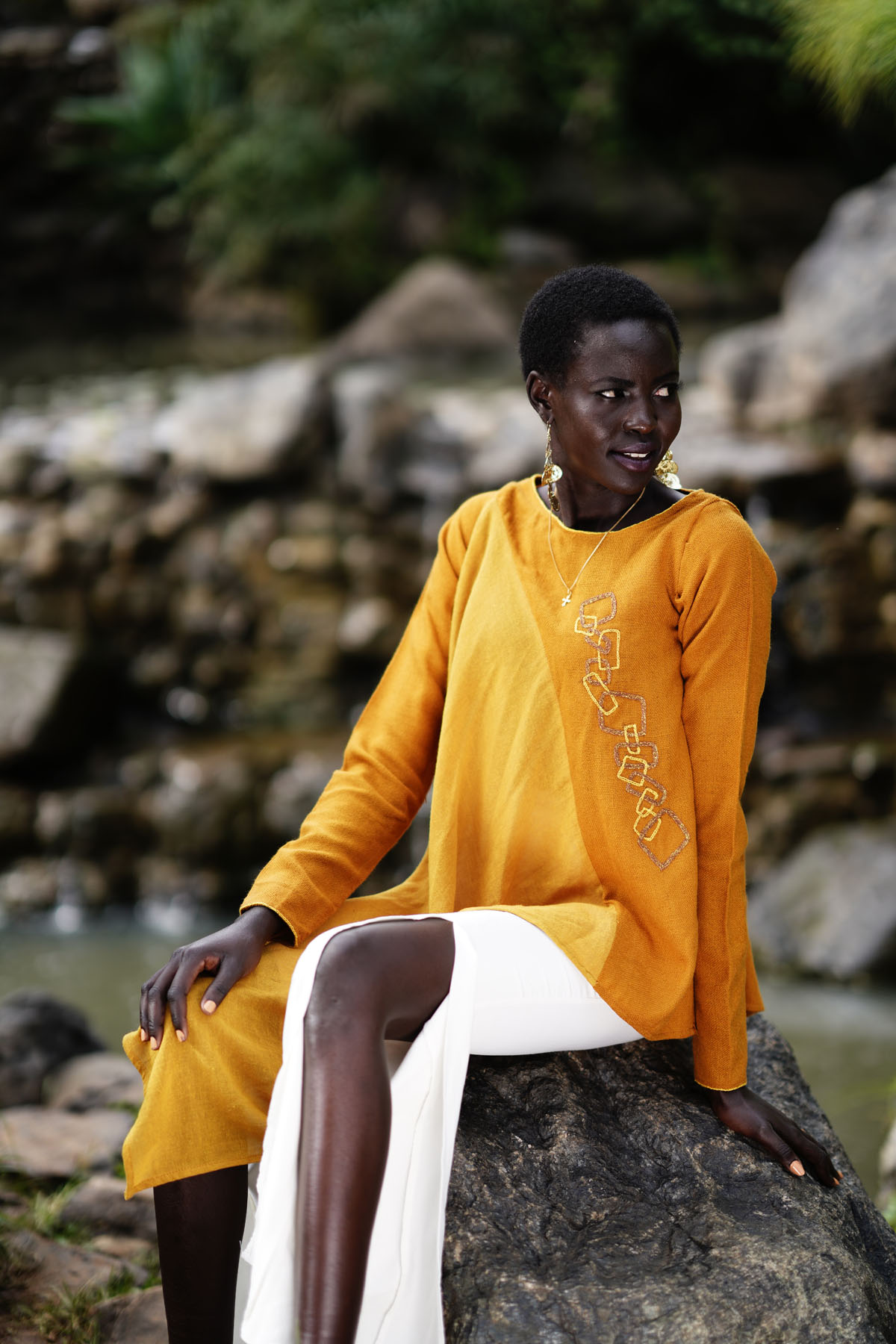 Adorned with intricate hand embroidery in gold and light yellow, this top showcases the artistry of our skilled artisans. The asymmetrical hemline, longer on the right side, adds a touch of contemporary flair. Perfect for special occasions or everyday wear, our Golden Enkutatash Top is a must-have for any wardrobe.