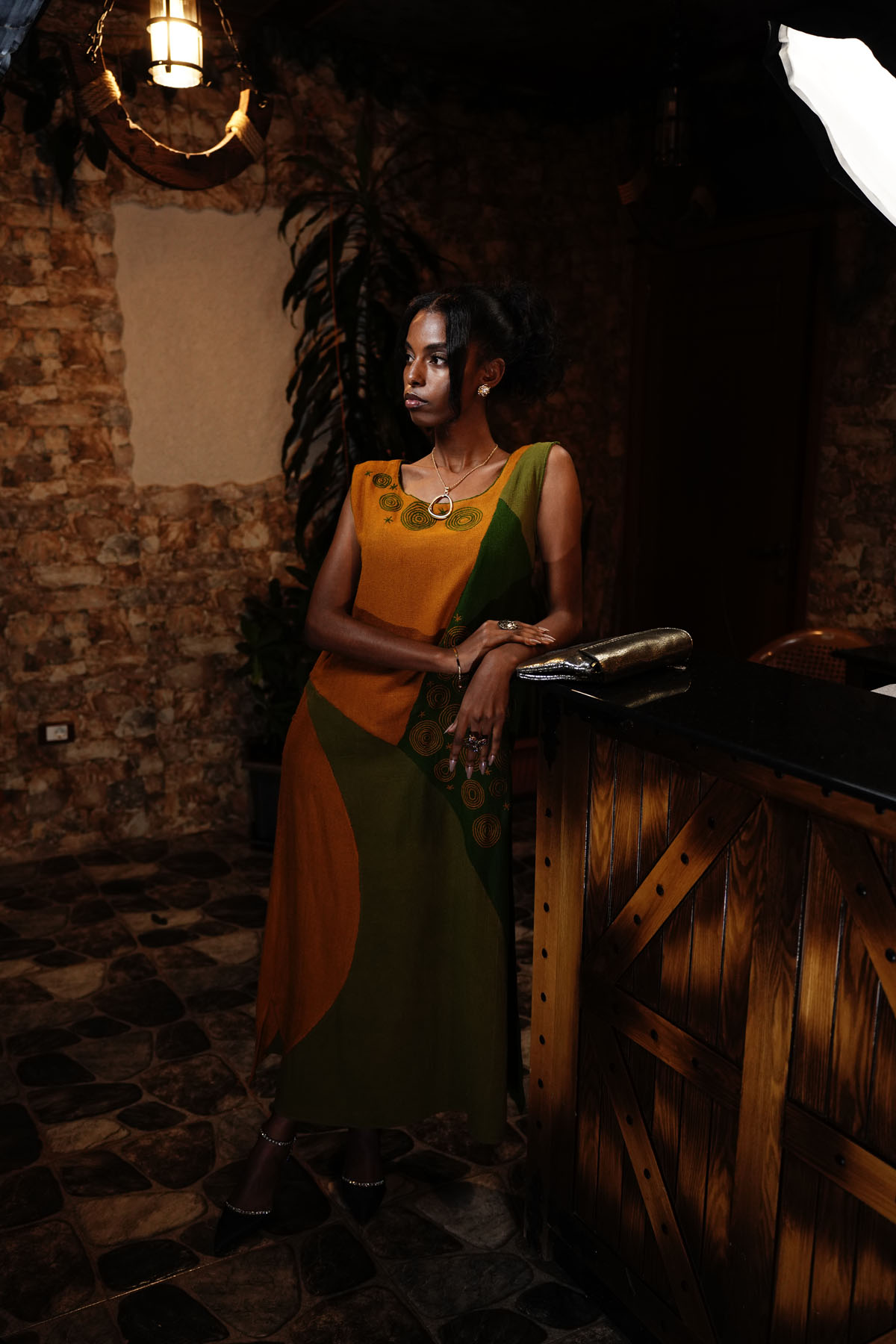 Indulge in the captivating beauty of our Maxi Dress. This handcrafted masterpiece features a stunning blend of green, forest green, and golden hues, creating a visually striking pattern. The delicate stars and circle decorations add a touch of sophistication to the design.
