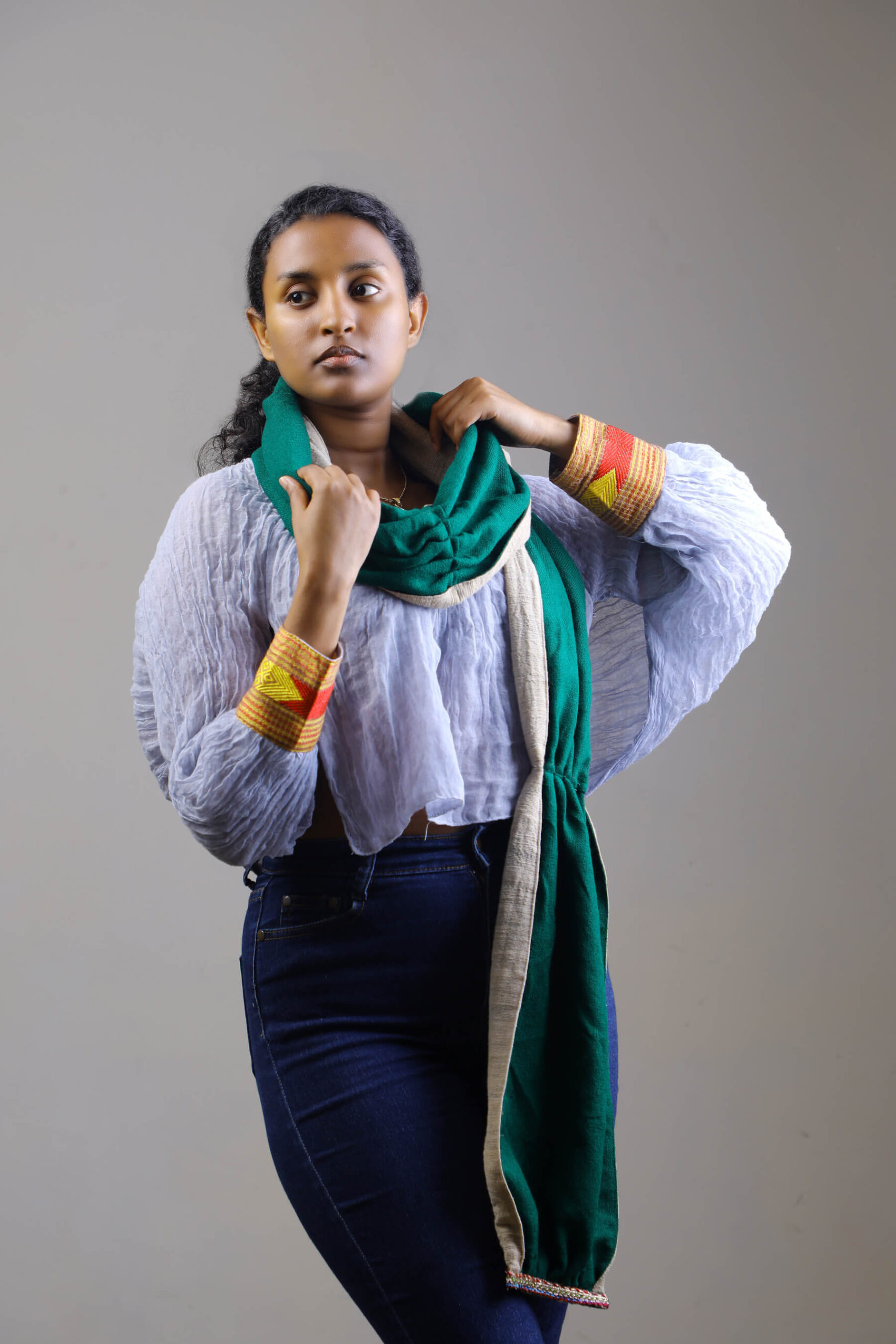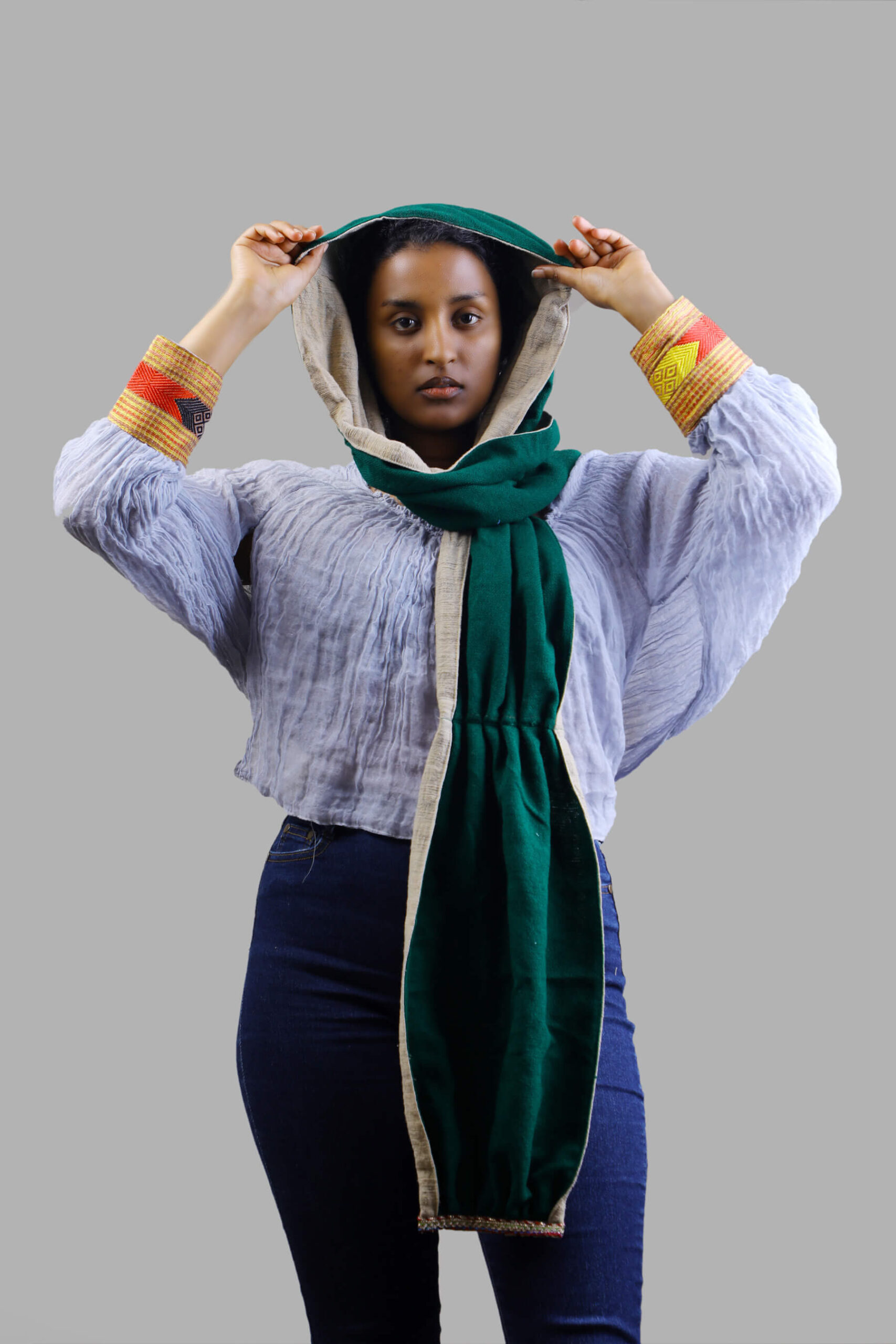 Green and gray two side scarf Enkutatash (Fall) collection – From Ethiopian new year 2016 E.C. (2023) Hand made, Menen fabric, 100% cotton and Ecofriendly Dyed. Dress number: L 042 Size: Free size