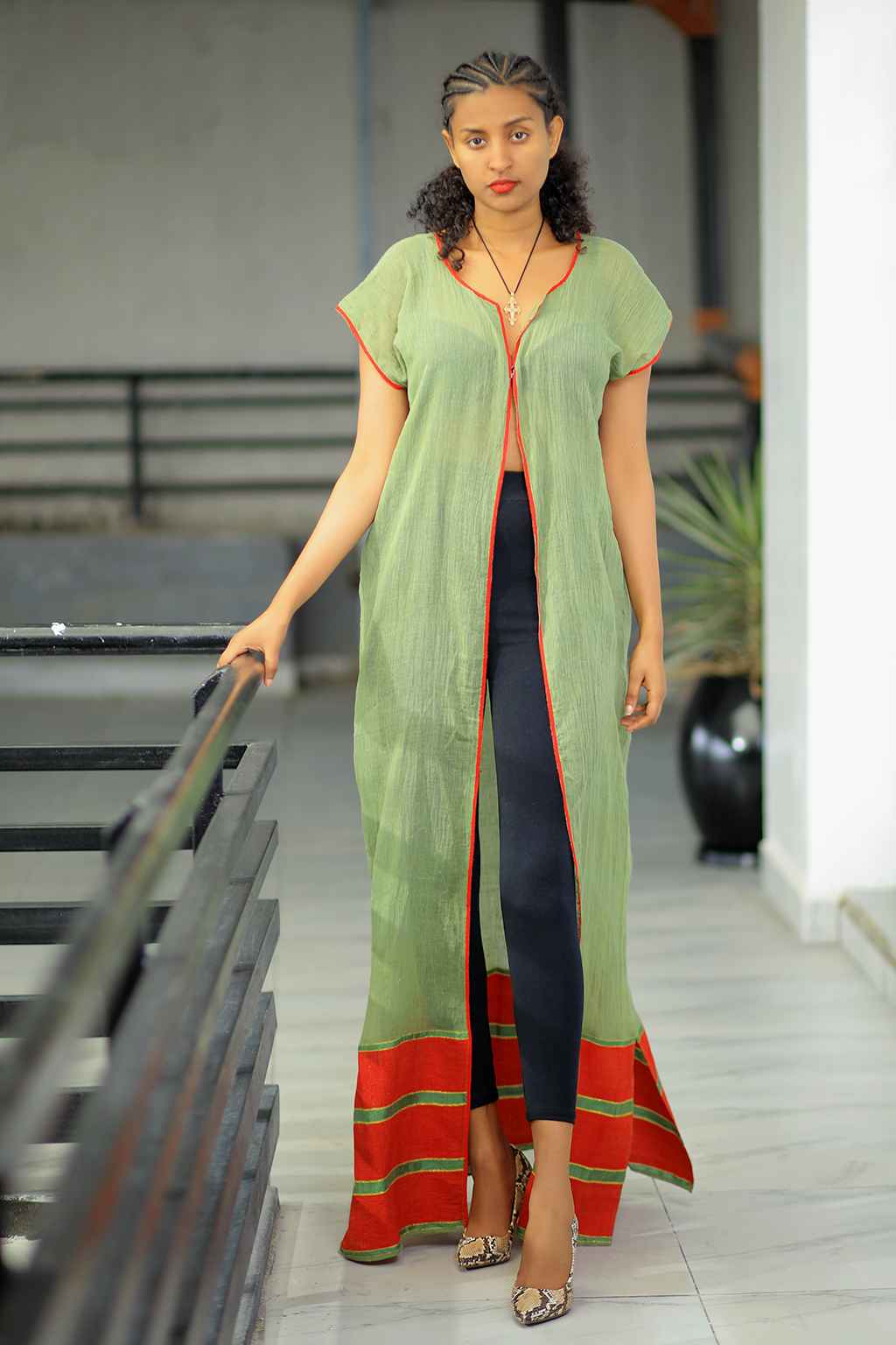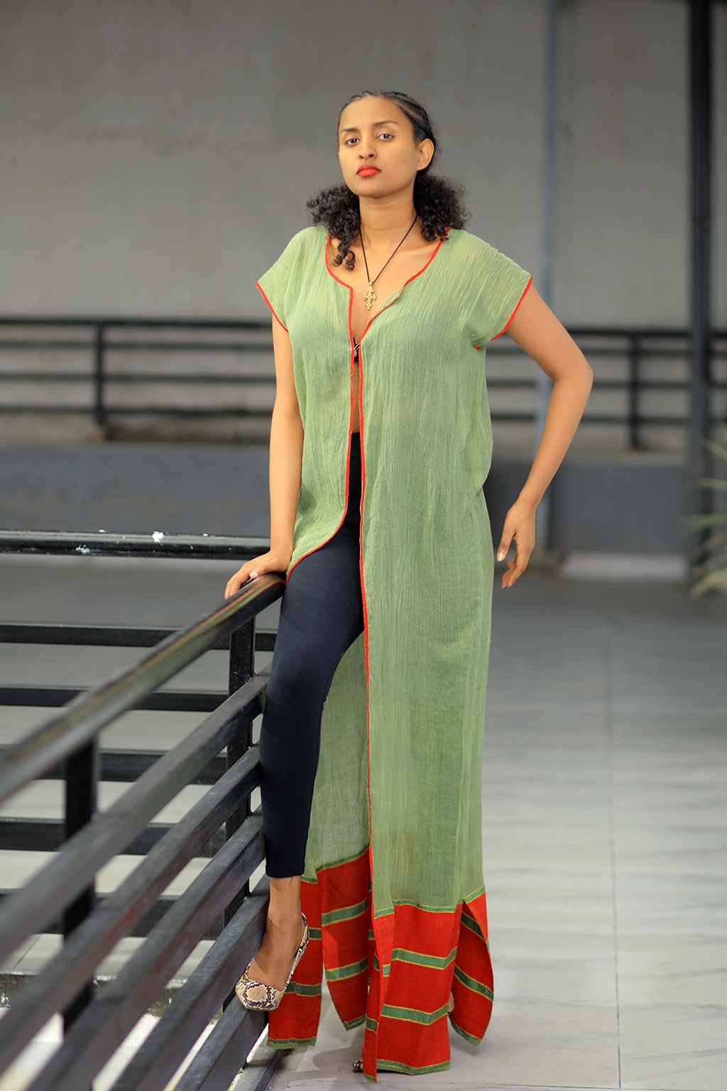 Green colored Summer long top with red color stripe Tillet From 2015 (2022) Ethiopian new year collection Hand made 100% cotton Dress number: I 019 Size: Free size