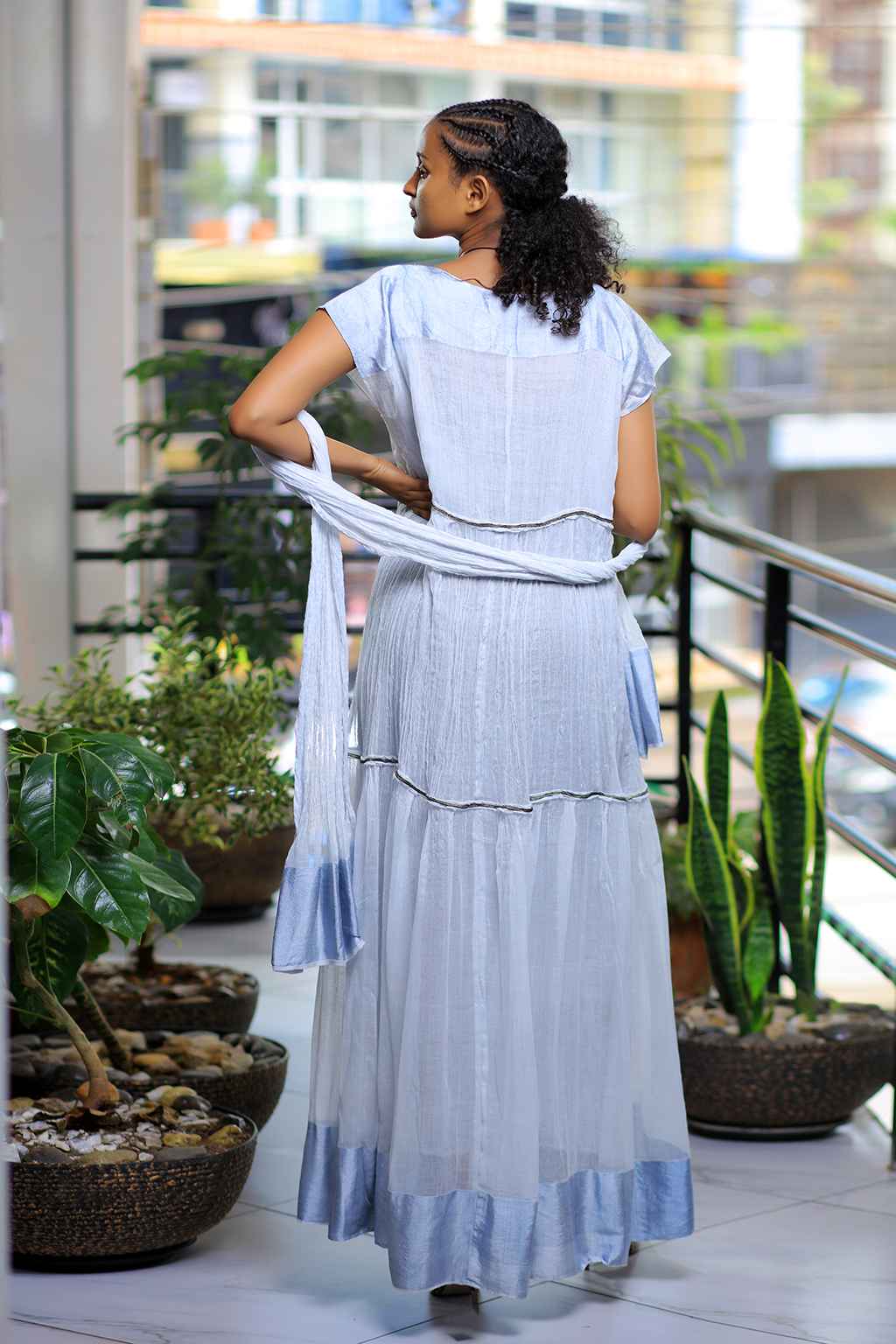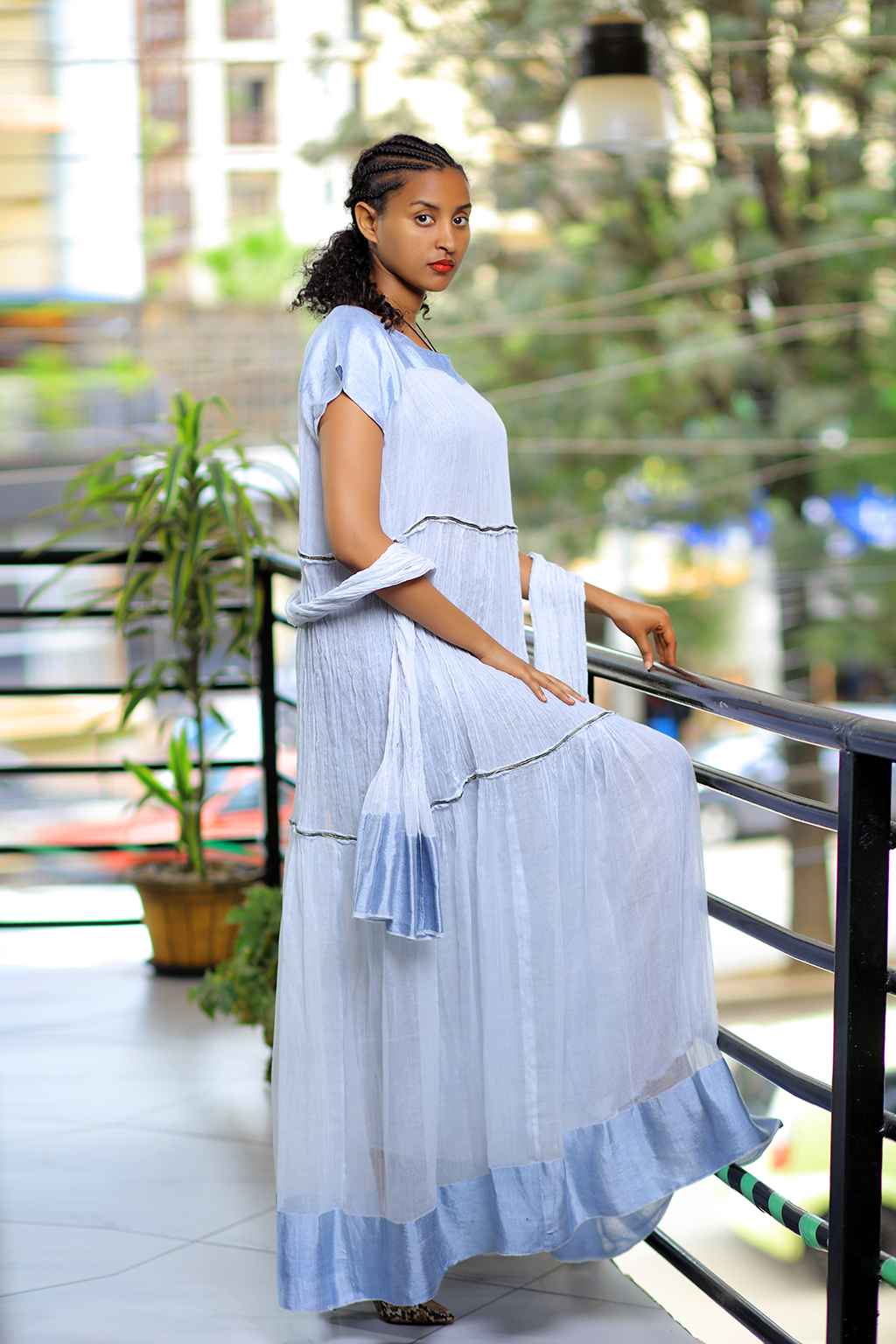 Baby blue colored Summer long dress with Sky color Tillet From 2015 (2022) Ethiopian new year collection Hand made 100% cotton Dress number: I 019 Size: S | M | L