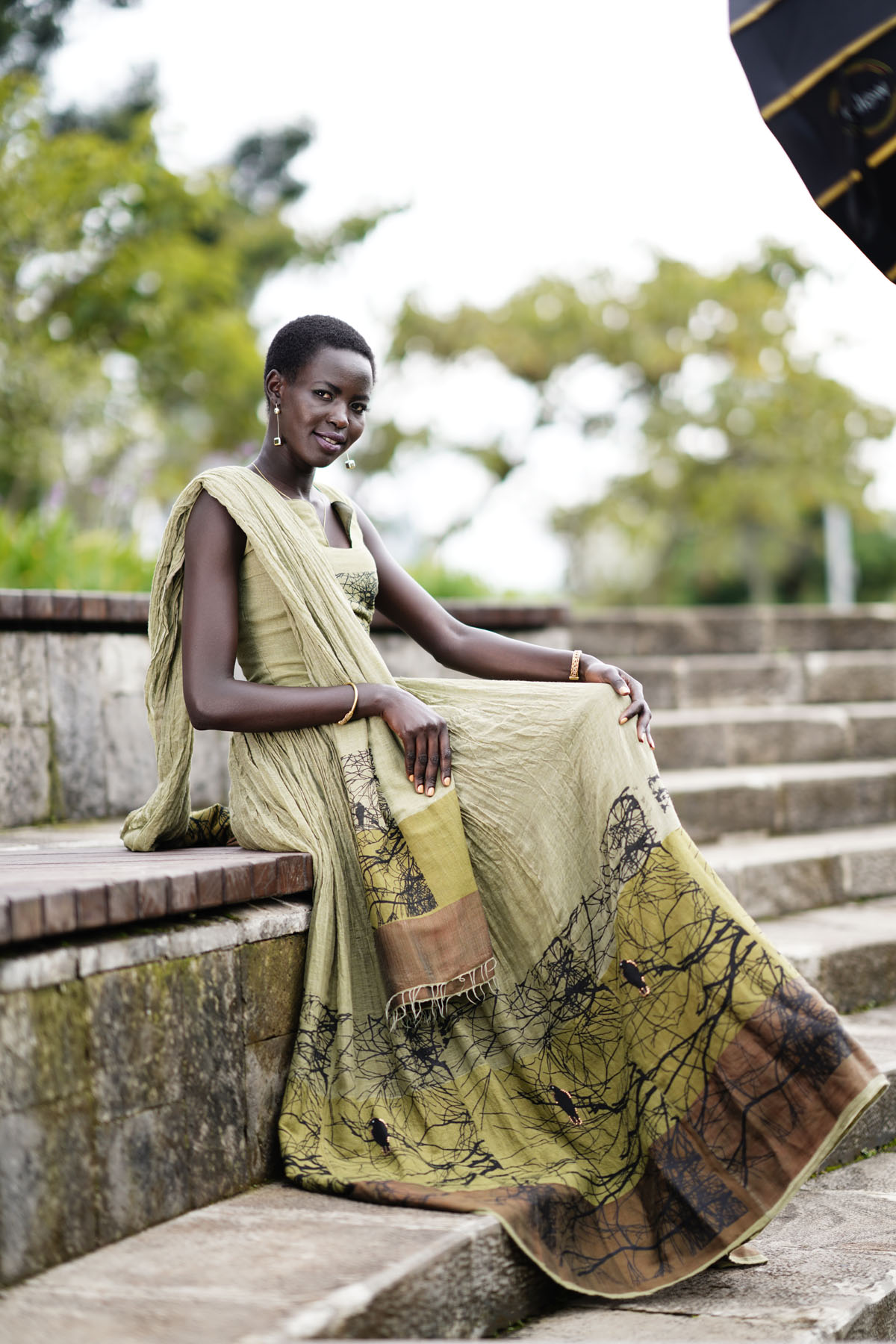 Features: Sleeveless, unique v shaped neck dress. It have brown and green stripe decor (Tilet) with a tree and bird print decor on upper front side and around the dress on the bottom.