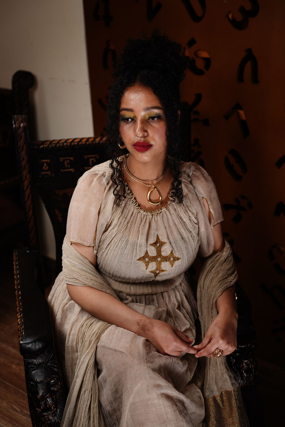 Features: Hand embroidery neckline decor, golden cross design at chest as well as above the Tilet and Shiny golden Tilet (Werkezebo). The dress have scarf (Small Netela)