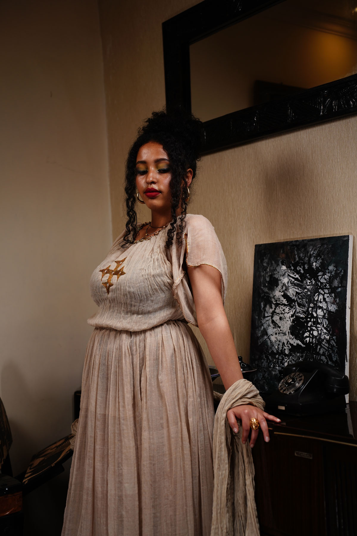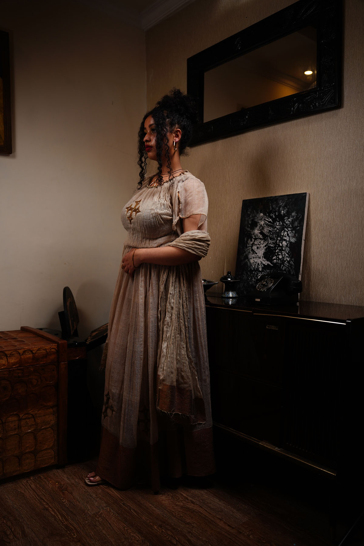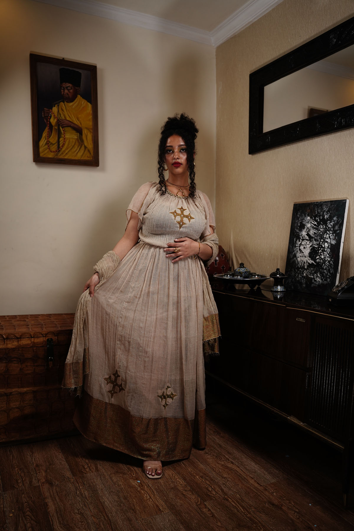 Complete your ensemble with the included small Netela scarf for a touch of traditional Ethiopian flair. Our long cream dress is a perfect blend of heritage and contemporary style, ideal for special occasions or everyday elegance.