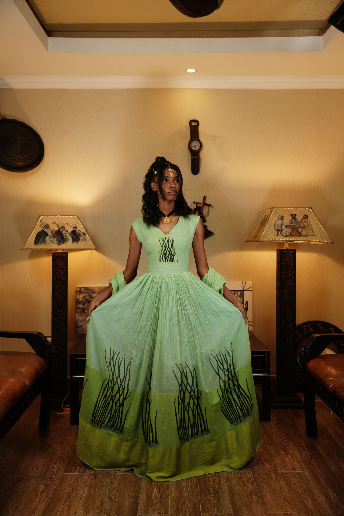 The sleeveless design and V-neckline offer a modern touch, while the horizontal stripe Tilet in Lemon and light green colors provides a unique and visually striking element. The long grass print decor at the chest and around the bottom adds a touch of natural beauty.