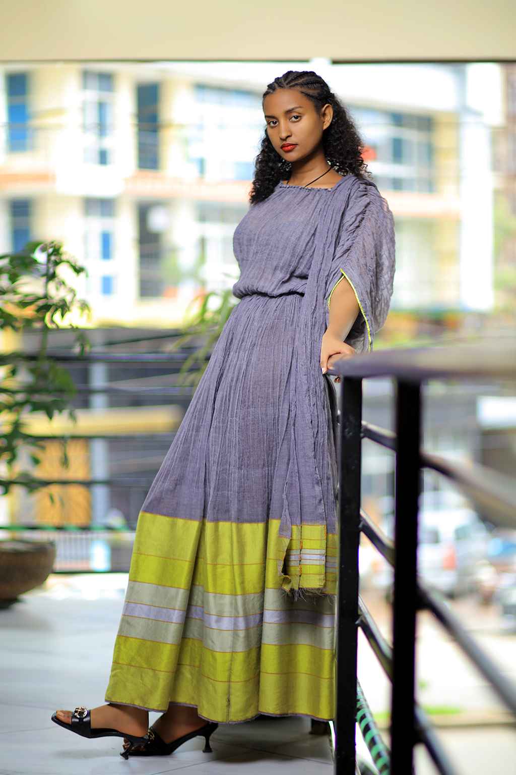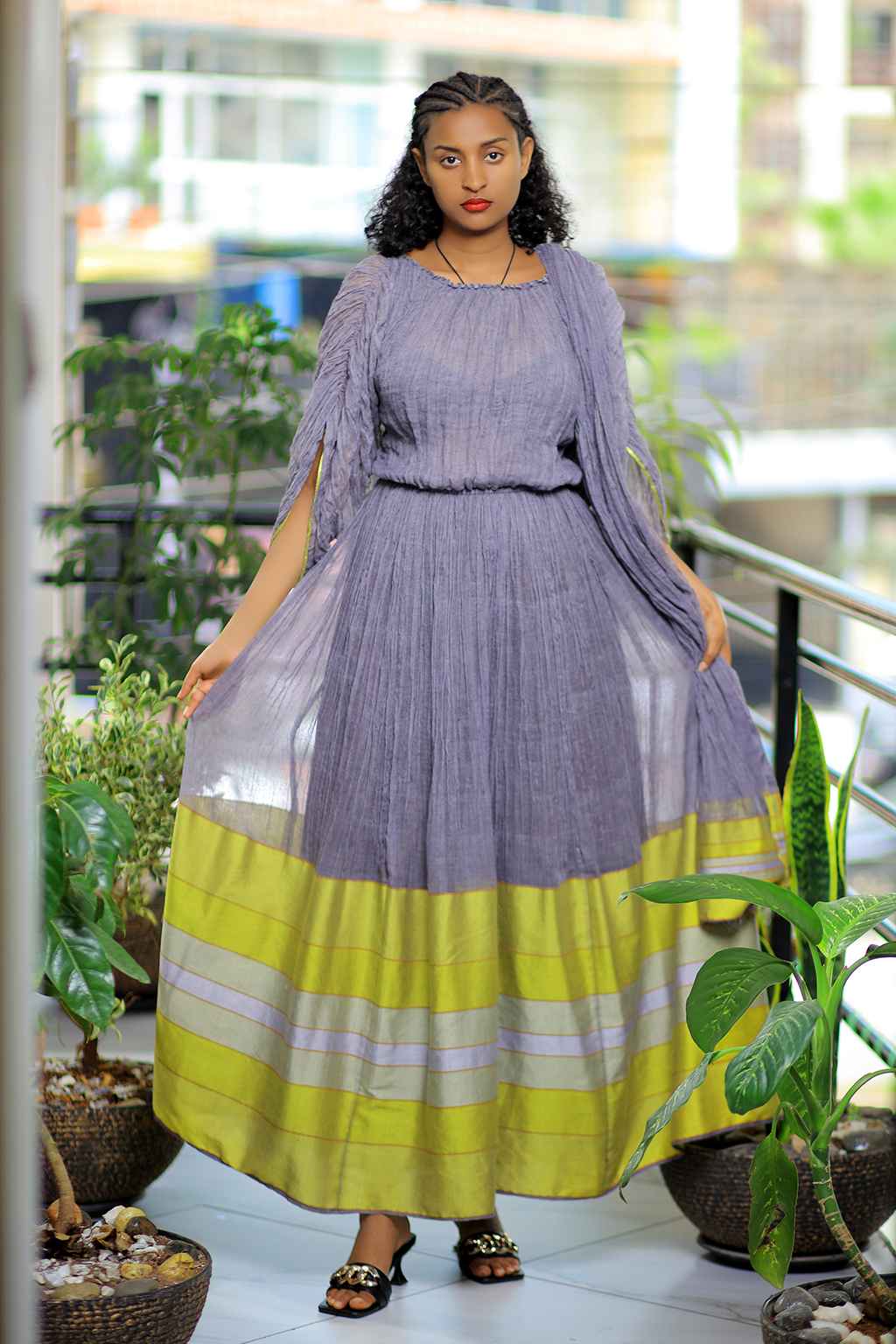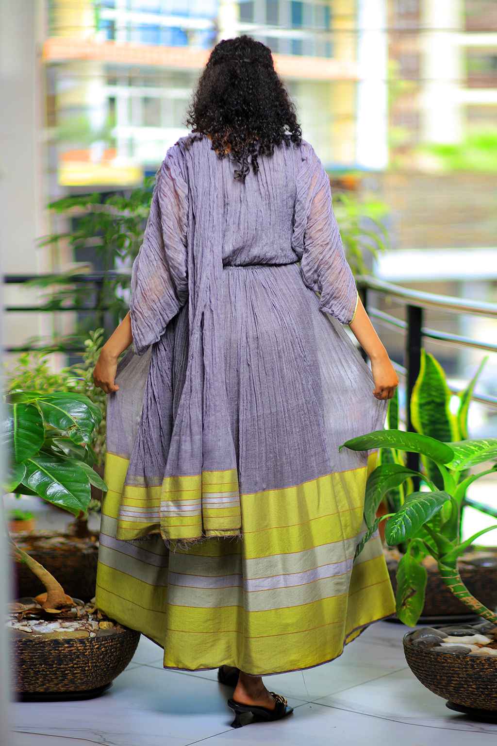 Pigeon colored Ethiopian cultural long dress with yellow and silver stripe Tillet