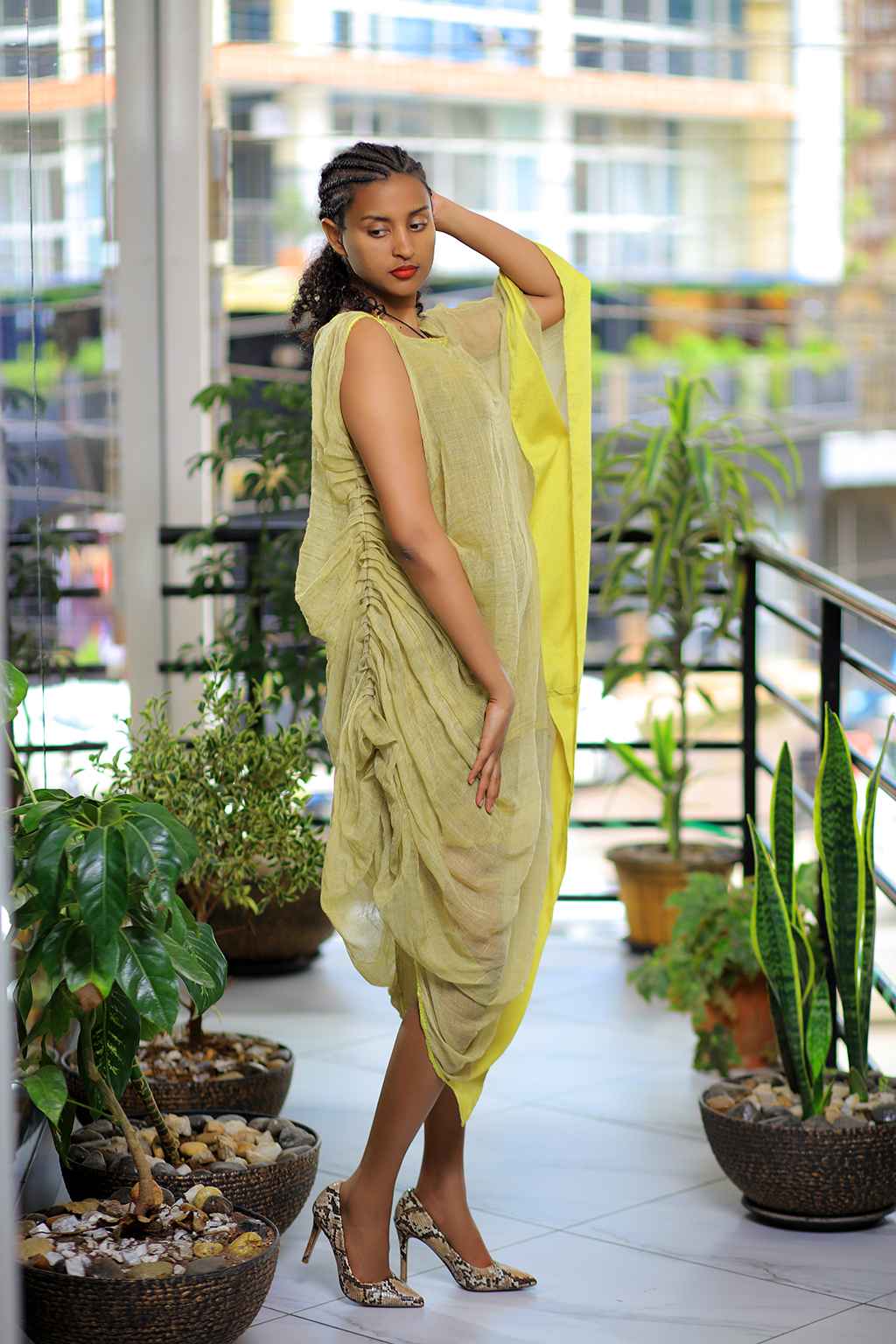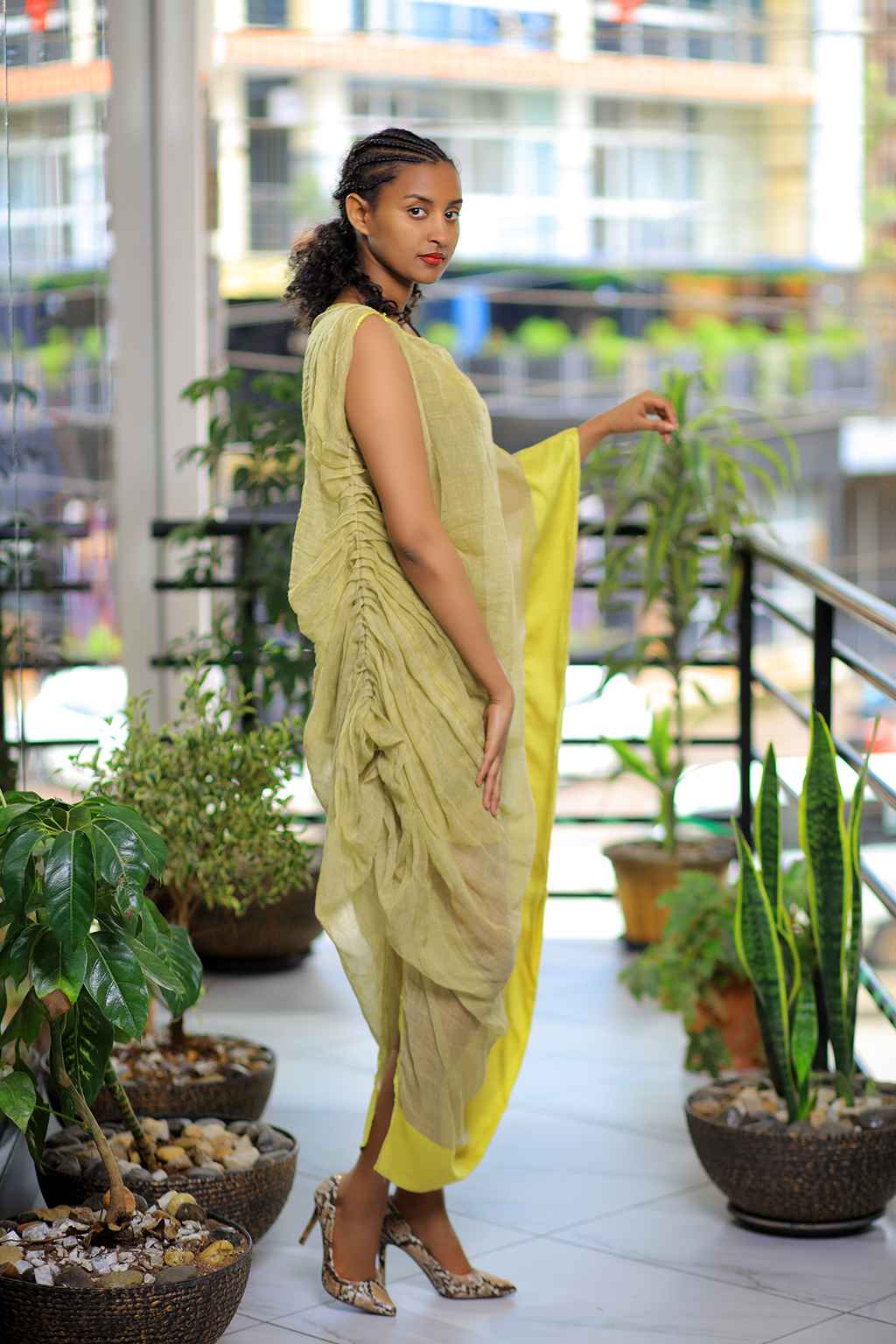 Pineapple colored Summer long dress with Yellow Tillet * Yellow Tillet on the side of the dress From 2015 (2022) Ethiopian new year collection Hand made 100% cotton Dress number: I 021 Size: S | M | L