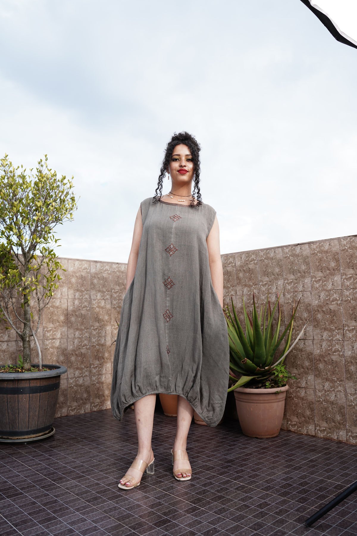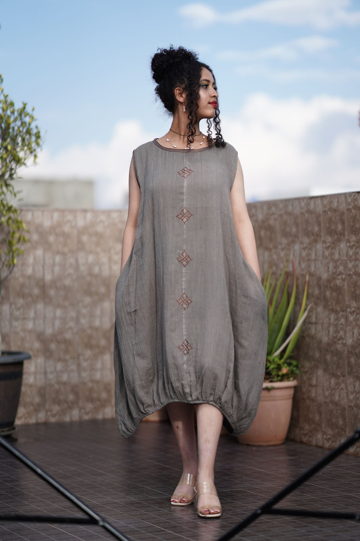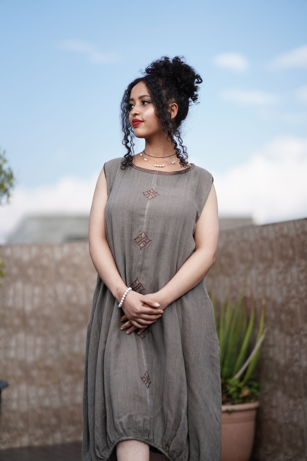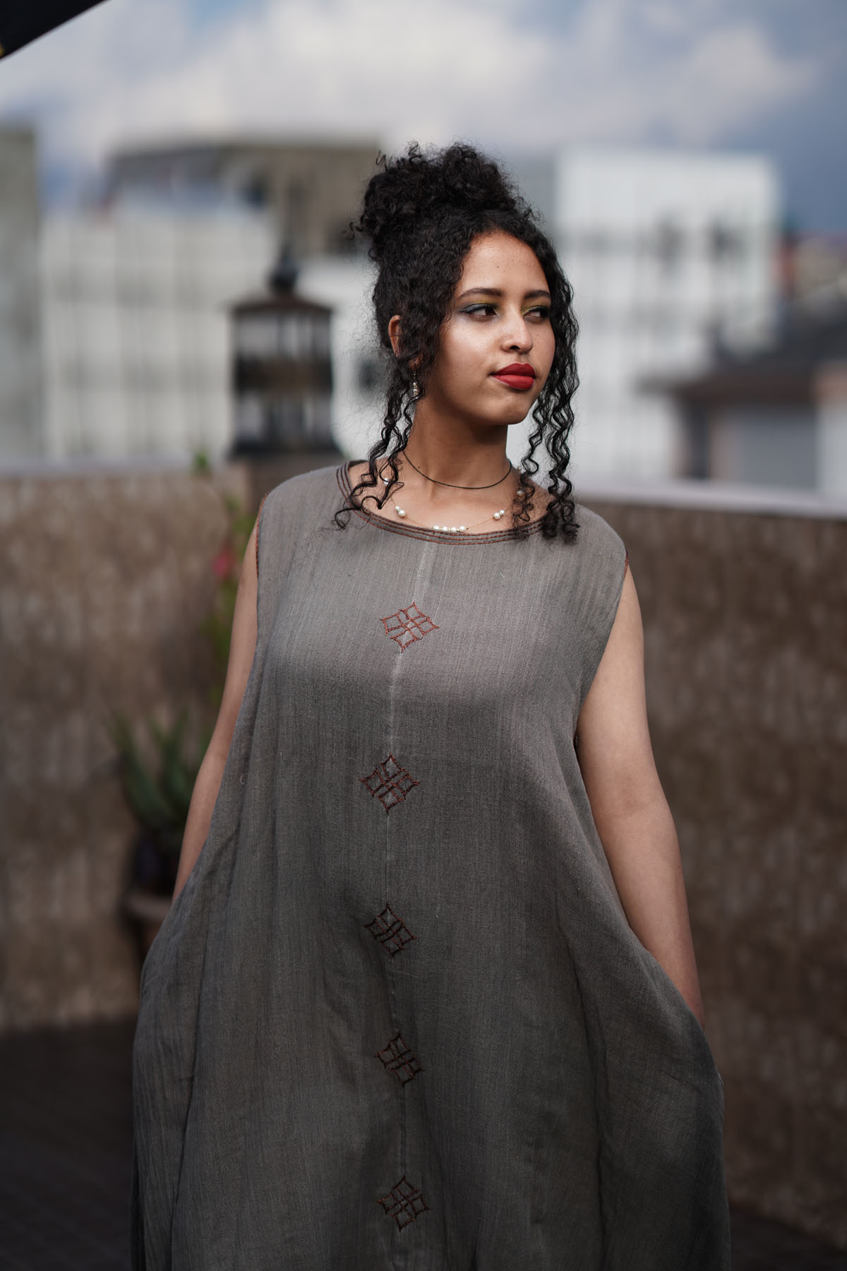 Discover timeless elegance in our handcrafted sleeveless gray dress. This exquisite piece, hand woven from 100% cotton, reimagines traditional Ethiopian design for a modern aesthetic. The dress features a circular neckline adorned with intricate hand embroidery, while a diamond pattern cascades down the center, adding a touch of sophistication.