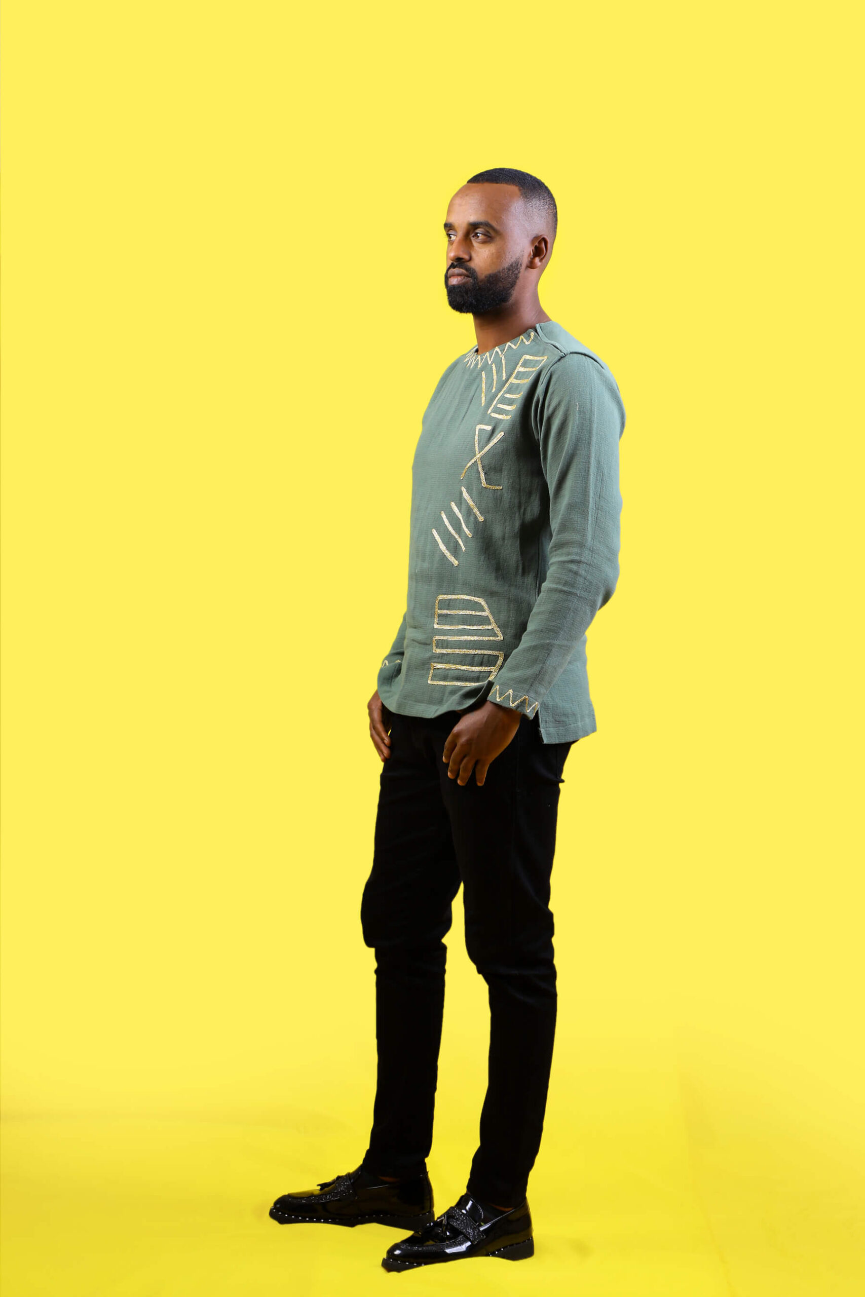 Teal men top with golden art Enkutatash (Fall) collection – From Ethiopian new year 2016 E.C. (2023) Hand made, Menen fabric, 100% cotton and Ecofriendly Dyed. Dress number: L 018 Size: Free size
