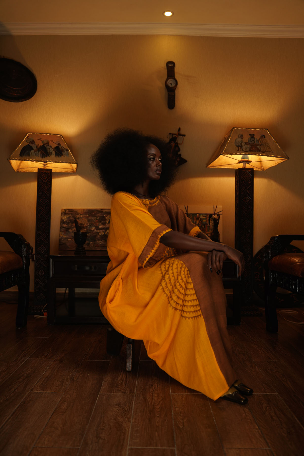 Discover the unique beauty of our Yellow and Brown Coffee Dress. This handwoven maxi dress features a captivating blend of colors, offering a fresh and modern take on traditional Ethiopian design. The dress boasts a comfortable circle neckline and is adorned with intricate hand embroidery at the neckline and a half-circle pattern on the front.