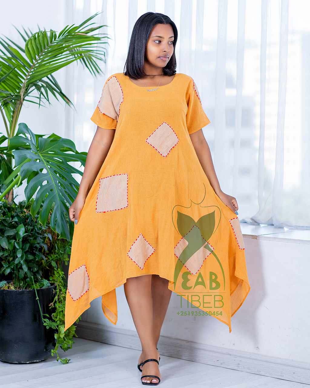 Yellow colored Summer long dress with Sky color Tillet From 2015 (2022) Ethiopian Christmas and Timket collection Hand made 100% cotton Dress number: J 025 Size: Free size